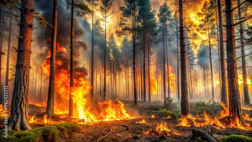 Forest landscape ablaze with flames and smoke, wildfire, burning, trees, destruction, disaster, environment
