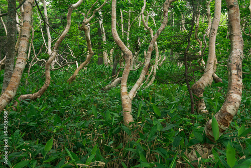 forest landscape of the island of Kunashir, twisted trees and undergrowth of dwarf bamboo