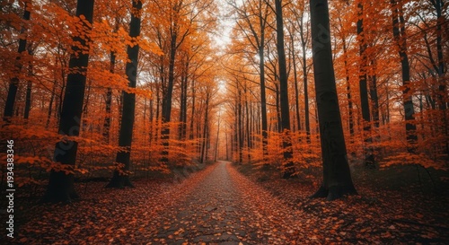 Forest path ablaze in autumn colors, trees standing tall