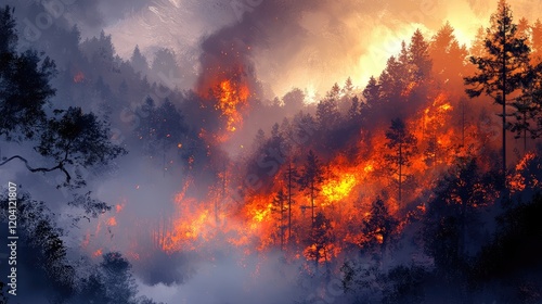 Forest wildfire with flames engulfing trees and smoke in the atmosphere during sunset. Dramatic landscape nature scene with Copy Space.
