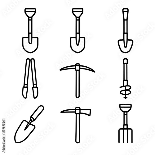vector, icon, mattock, digging, shoveling, hole, tool, fork, spade, scoop, dirtied, post, shovel, auger, collection, minimal, set, symbol, contour, stroke, line, outline