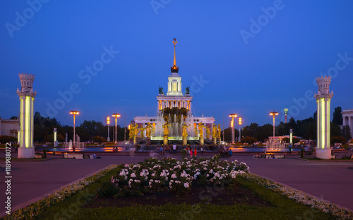 Fountain "Friendship of People" and the main building of the Exhibition Centre VDNH (VVC) of 1950 year in the late evening after sunset, Moscow, Russia.