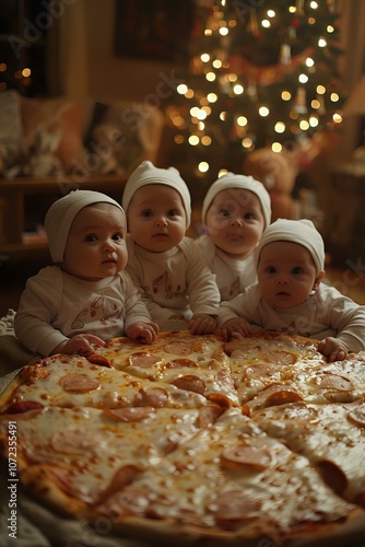 Four adorable babies in white winter hats gathered around festive pizza during holiday celebration with Christmas tree lights in cozy warm atmosphere.