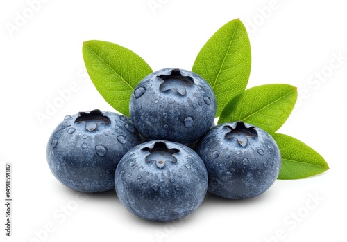 Four blueberries with water droplets and green leaves isolated on a white background