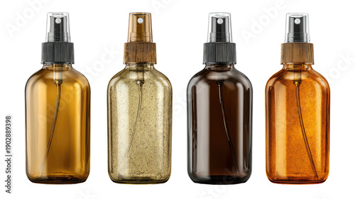 bottle, spray, atomizer, glasses, container, liquid, product, cosmetic, brown, amber, dark, light, clear, plastic, nozzle, dispenser, beauty, care, hygiene, wellness, health, isolated, transparent, still, life, object, collection, group, presentation, black, background, nobody, sustainable, minimalist, elegant, modern, pharmacy, remedy, apothecary, natural, organic, clean, aromatherapy, essence, essential, oil