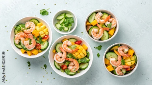Four Bowls of Shrimp Mango Salad Top View, Flat Lay, Food Photography, Recipe Shrimp salad, mango salad, healthy food