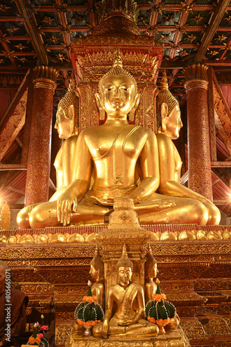 Four Buddha statues in the posture of Maravichai, facing out to the gates in all four directions, with bases built inside Buddhist Church at Wat Phumin. Located at Nan Province in Thailand.