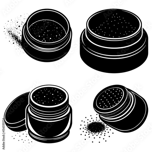 cosmetic, powder, container, lid, black, white, isometric, view, make-up, beauty, product, cosmetic, illustration, design, graphic, art, drawing, vignetting, outline, shape, style, decorative, element, symbol, icon, isolated, background, closeup, arrangement, top, side, open, closed, package, cardboard box, glistering, shiny, sparkle, dust, scattered, minimalist, modern, elegant, simple, monochrome, artistic, creative, stylish