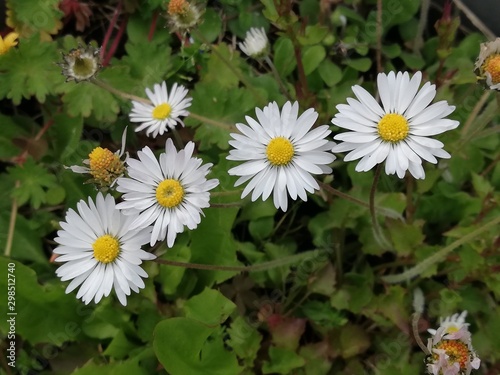 four daisies in line on the grass