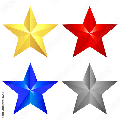 Four glossy three dimensional five pointed stars one gold, one red, one blue and one silver. Vector illustration