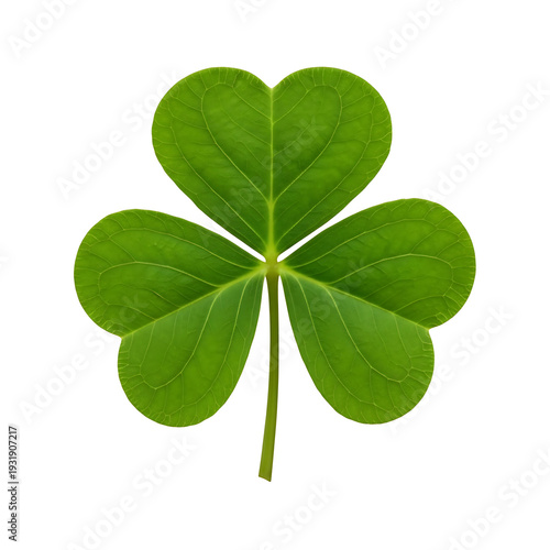 Four leaf clover symbolizing good luck and fortune, vibrant green leaf with distinct heart-shaped lobes and central stem. Four leaf clover represents hope, faith, love,