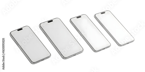 Four modern smartphones display blank screens ready for your creative design and app promotion