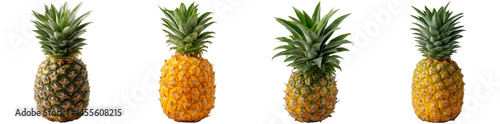 Four pineapples arranged in a sequence, highlighting their diverse stages of ripeness from green to yellow. Ideal for tropical cuisine and healthy dishes