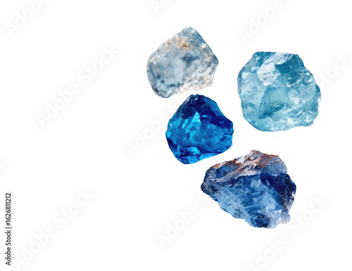 Four rough-hewn, light-to-deep blue gemstones, arranged in a loose cluster against a black background. The stones show a variety of textures and hues within their blue tones