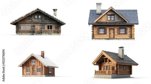 Four rustic wooden cabins, varying in size and design, shown against a white background; some feature snow-dusted roofs, chimneys, and small porches