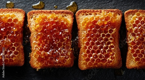 honeycomb, honey, bread, toast, slice, dark, surface, gold, sweet, breakfast, food, delicious, dessert, texture, pattern, hexagon, cell, drip, closeup, overhead, amber, brown, rustic, background, still life, photo, appetising, organic, natural, viscous, sticky, treat, snack, comfort, golden brown, crispy, warm, rich, healthy, alimentary, energy, sweetness, comb