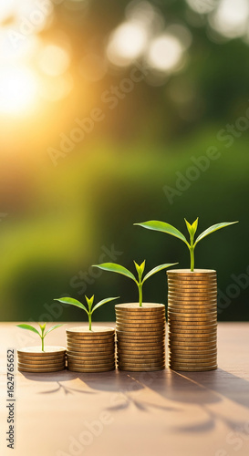 Four stacks of gold coins, increasing in size, each topped with a growing sprout, set against a blurred green background, symbolizing financial growth and investment