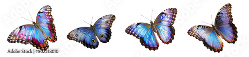 Four Vibrant Morpho Butterflies in Flight