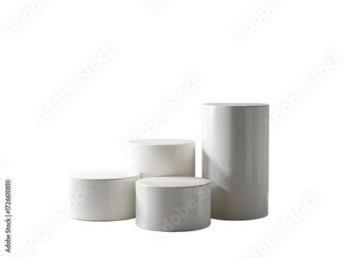 Four white cylinder podiums isolated on transparent background, perfect for showcasing products in a modern setting