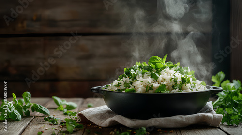 rice, basil, cilantro, fragrant, steam, rustic, wooden, surface, herb, sprig, linen, napkin, warm, lighting, homely, flavorful, sharp, realistic, detailed, aromatic, fresh, organic, natural, wholesome, culinary, comforting, vibrant, photorealistic, food, inviting, meal, vegetable, pan, dinner, meat, cooking, vegetable, healthy, dish, green, lunch, cookery, chicken, hot, salad, plate