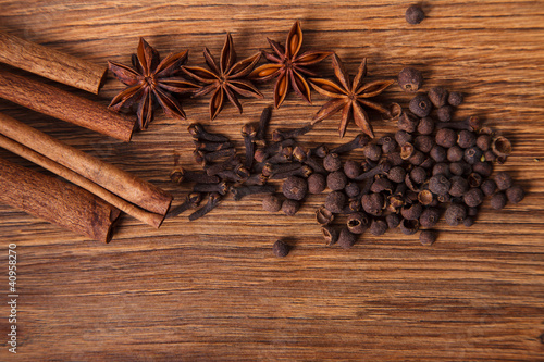 Frame composition of spices on wood,anise,cinnamon,laurel