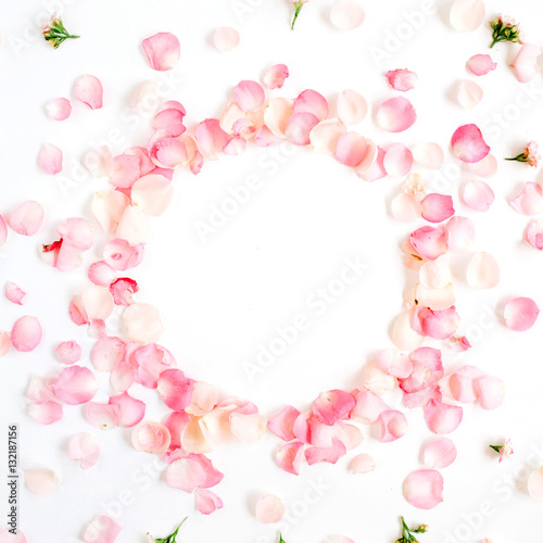 Frame made of pink roses petals on white background. Flat lay, top view. Valentine's background
