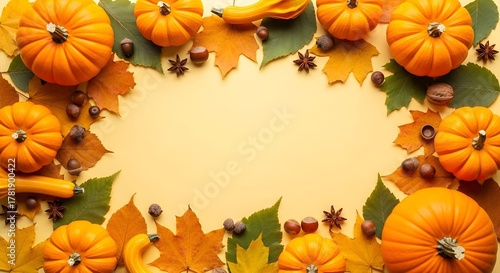 Frame of colorful autumn leaves and pumpkins on pastel yellow background. Banner template for Thanksgiving Day, autumn harvest decor for invitation or seasonal or halloween card with copy space.
