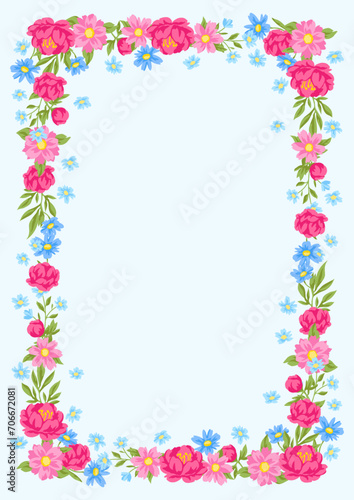 Frame with pretty flowers. Beautiful decorative natural plants and leaves.