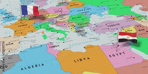 France and Egypt - pin flags on political map - 3D illustration