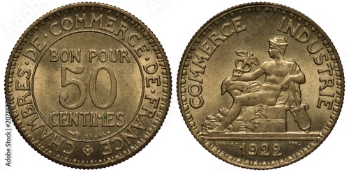 France, French coin 50 fifty centime 1921, inscription in French French Chamber of Commerce, seated Mercury holding caduceus and cithara, date below,