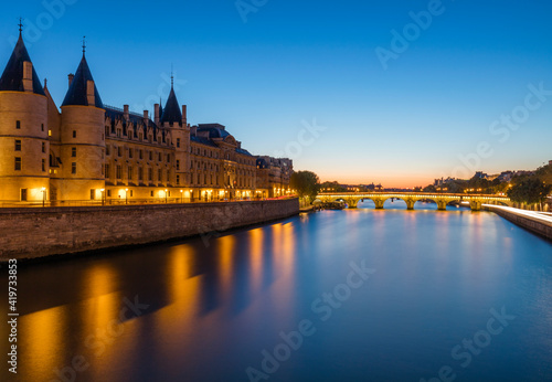 France, Ile-de-France, Paris, Conciergerie and Seine canal at dusk with Pont Neuf in background