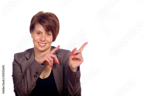 business, finger, woman, fun, luck, man, person, presentation, student, studio, symbol, imagery, alone, brown, brunette, friendly, merry, happy, bright, pretty, young, laugh, learn, smile, girl, positive, present, crosswise, horizontal format, page, lateral, study, vertical, female, white, signs, point, contented