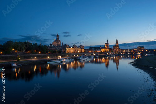Frauenkirche in Dresden an der Elbe beim Sonnenuntergang