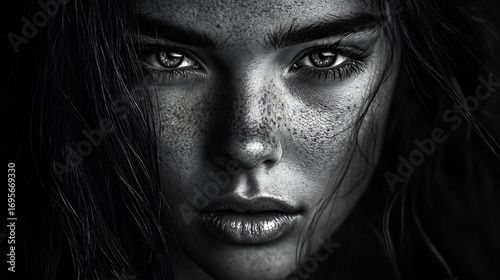 portrait, monochrome, black, white, photo, freckle, face, eye, intense, gaze, dramatic, mood, dark, hair, closeup, model, beauty, art, artistic, image, photo, picture, visual, graphic, print, canvas, wall, decor, home, style, elegant, powerful, serious, expression, captivating, masterpiece, commercial, advertising