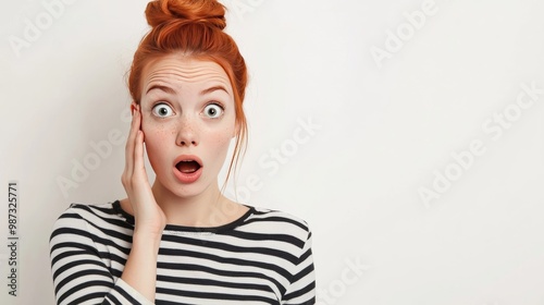 amazed, appearance, attentive, attractive, background, beautiful, beauty, bewilderment, casual attire, confused, curly, emotion, emotional, expression, expressive, face, facial, female, freckled, freckle, hair, hand, head, hipster, horizontal, human, indoor, isolated, lovely, mouth, 1, people, person, personality, portrait, pretty, puzzled, reaction, shirt, stare, striped, student, stylish, wall, woman, wonder, young, youngster