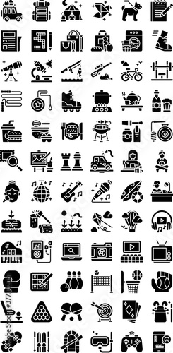 activity, bag, ball, beach, boxing gloves, camera, card, chess, computer, cycling, design, dog, exercise, farming, food, free, golf, guitar, earphones, healthy, icon, illustration, kite, laptop, baggage, make up, microphone, music, piano, playing, pool, set, signs, sport, sport, television, time, van, vector, video game