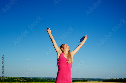 Freedom of people from wearing medical masks and social distance. End of quarantine and general removal of masks. Joyful girl throws up the mask against the blue sky