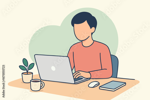Freelancer man working on laptop at home desk, concept of productivity and remote work.