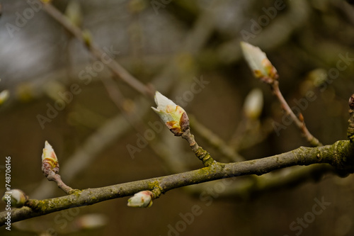 Fres leaf buds of a horse chestnut tree in spring, selective focus with bokeh background - Aesculus hippocastanum