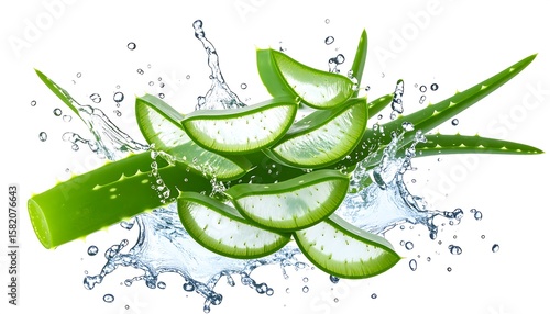 aloe, vera, slice, water, splash, fresh, green, healthy, beauty, skincare, plant, natural, hydratation, moisturiser, gel, cut, vitamin, organic, juice, product, treatment, botanical, wellness, health, liquid, saturated, image, isolated, white, background, composition, closeup, food, medicine, cosmetic, therapy, extract
