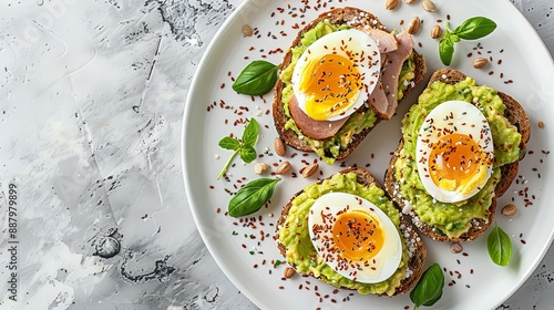 Fresh and Healthy Morning Meal with Avocado, Turkey, and Soft-Boiled Eggs on Toast