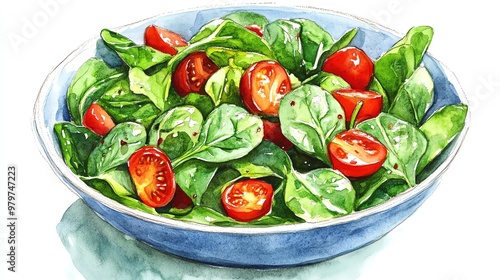 Fresh and vibrant spinach salad with cherry tomatoes in a blue bowl, perfect for healthy meals and recipes.