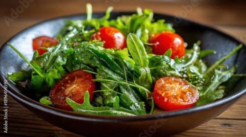 Fresh arugula and tomato salad in black bowl on wooden table.