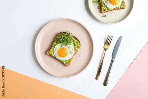 avocado, toast, egg, breakfast, food, healthy, meal, plate, cutlery, fork, knife, light, colourful, brunch, kitchen, culinary, epicure, nourishment, vegetarian, cookery, snack, delicious, eat, dining, table setting, cooking, receipe, organic, simple, natural, wholesome, modern, home cooked, aesthetic, vibrant, tasty, goodness