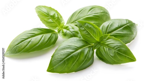 Fresh Basil Leaves with a Vibrant Green Color, Isolated on a White Background, known for their vibrant green color and aromatic scent, Professional Herbal Photography
