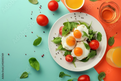 Fresh breakfast with eggs Benedict and stylish plate on colored surface
