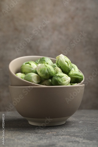 Fresh Brussels sprouts in bowl on grey table