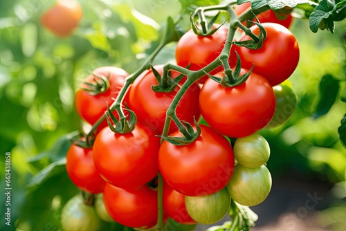 Fresh bunch of red natural tomatoes on a branch in vegetable garden.