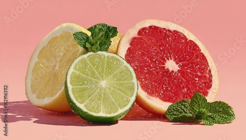 citrous, fruit, slice, lemon, lime, grapefruit, mint, healthy, vibrant, colourful, juicy, fresh, vitamin, food, nourishment, diet, tropical, summer, pink, background, closeup, still life, closeup, segment, acidic, vitamin c, yellow, green, red, organic, natural, delicious, tart, sweet, refreshing, bright, composition, display, arrangement, studio, photo, poster, background