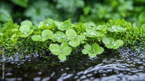 Fresh clover leaves in rain, water flowing over mossy stone, nature scene, close-up, for educational or nature imagery